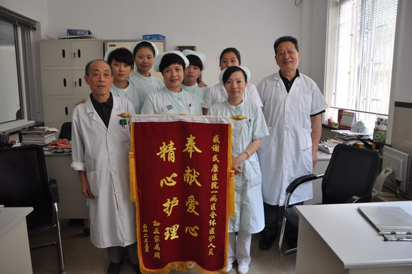 5月17日上午,病人孙正的家属送来一面锦旗,锦旗上的一句“精心护理,奉献爱心”表达了病人家属对我院一病区全体医护人员的感激之情。