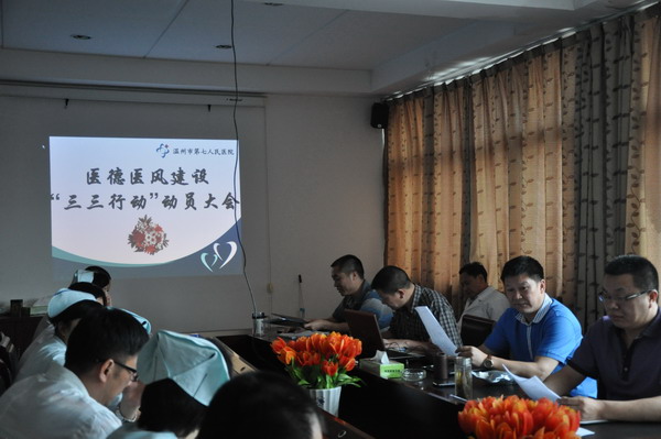 会上,胡立荣院长传达了全市卫生系统医德医风建设“三三行动”大会的精神,要求大家根据《温州市卫生系统开展医德医风建设“三三行动”实施意见》,认真开展以“创三无、促三好、提三率”为主题的医德医风建设“三三行动”,努力创建“无红包、无大方、无长队”医院,塑造“医德好、质量好、服务好”的医院形象,切实提高市民、患者和医务人员的满意率。胡立荣院长强调:要认清形势,提高认识;明确目标,落实责任;营造氛围,抓出成效,以“三三行动”为契机,努力提升我院整体医疗质量和服务水平,使我院医德医风上一个新台阶。