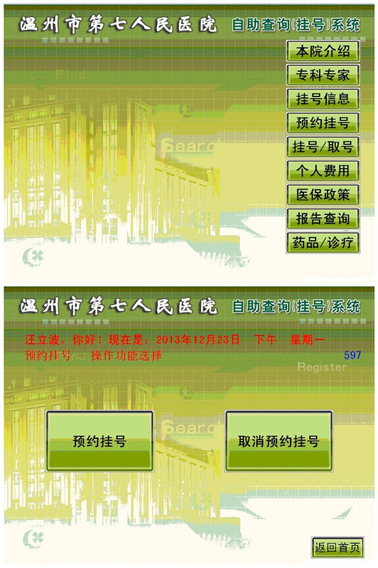 12月25日起,我院正式启用自助预约挂号服务机,患者可以通过自助方式预约专家,只需持有我院就诊卡就可直接自助挂号。自助预约挂号服务机有五大功能,方便患者就医。第一,可以直接使用医院就诊卡快速登记,即可马上预约医院的出诊专家;第二,可预约今天起两周内出诊的专家,方便患者安排时间,节省挂号排队的时间。第三,自助取号,网上预约,电话预约的用户可直接到自助终端进行取号,方便快捷,不用排队;第四,专家排班出诊时间查询;第五,专家详细资料介绍。