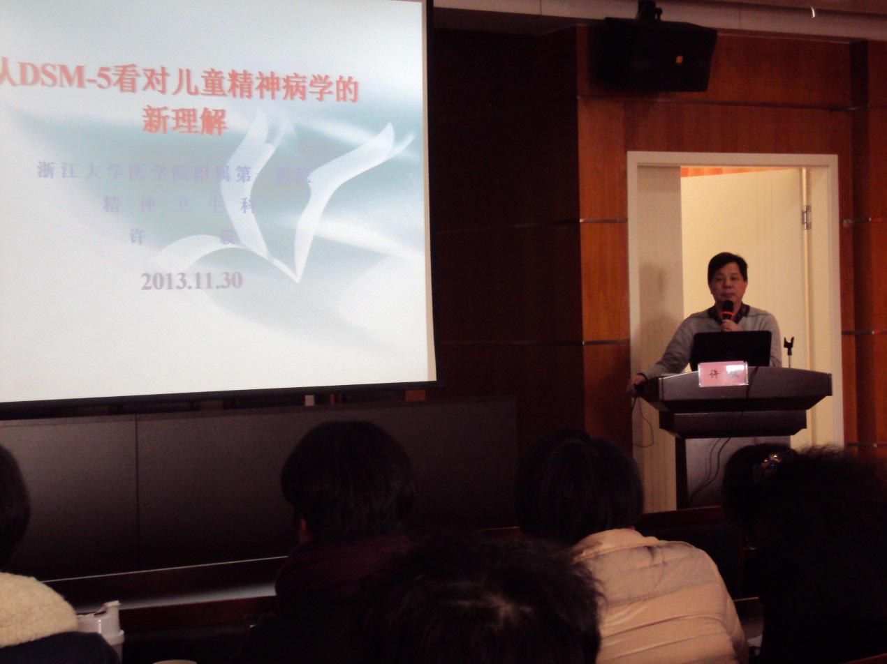 11月30日上午,由我院主办的市级继教项目《儿童青少年心理障碍的家庭治疗》学习班在康复楼六楼会议室举行,来自温州地区各个县市的社区卫生服务中心、学校、心理咨询室、综合医院的学员共计90余人参加了此次学习班。浙江大学医学院附属第一医院许毅教授为大家讲授从DSM-ⅴ看待儿童精神精神障碍,我院郑维芳副院长从冲突的觉知和抱持角度介绍了系统治疗的核心。会上专家们深入浅出的讲解和诙谐的语调一定程度上提高了精神卫生专业人员、教育工作者、心理咨询师对儿童青少年行为障碍的识别与干预工作,提高了从业人员对家庭治疗在儿童青少年行为障碍领域的应用能力。本次学习班同时建立了教育工作者、心理咨询师和精神卫生专业人员的沟通、交流和合作平台,促进对儿童青少年行为障碍的早期识别、转介及干预的顺利实施。