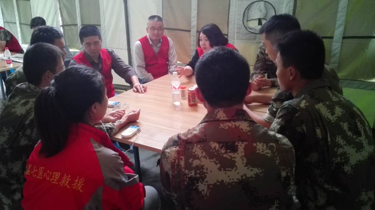 因连续多日在滑坡现场开展救援工作,个别战士因挖掘出已损坏的遇难者遗体后,出现了疑似幻嗅的症状,出现闪回、紧张等情绪,市七医心理救援队接到救灾现场部队的通知,马上赶到苏村,精神科医生和心理咨询师为3名救援官兵做了评估和辅导,结合他们彻夜难眠的现象,考虑官兵这样的心理状态是应激反应所致,这虽然是救援现场比较常见的现象,但仍然需要对他们的心理状况进行进一步的关注。10月7日下午,由心理治疗师主持、二级心理咨询师协同,为6名武警官兵进行了心理团辅。