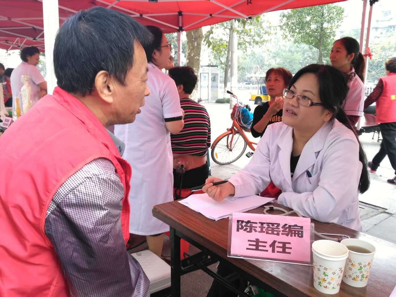 上午8点,活动还没开始,每个公益展台都已经围满了人。市七医一病区陈瑶偏副主任医师特别擅长中老年失眠、抑郁的治疗,此次活动更是发挥所长,在现场为饱受失眠困扰的社区居民提供咨询和帮助。市七医一病区护士许海瓯和防治科工作人员为现场的居民提供血压血糖测量,现场接受测量人数达120余人。
