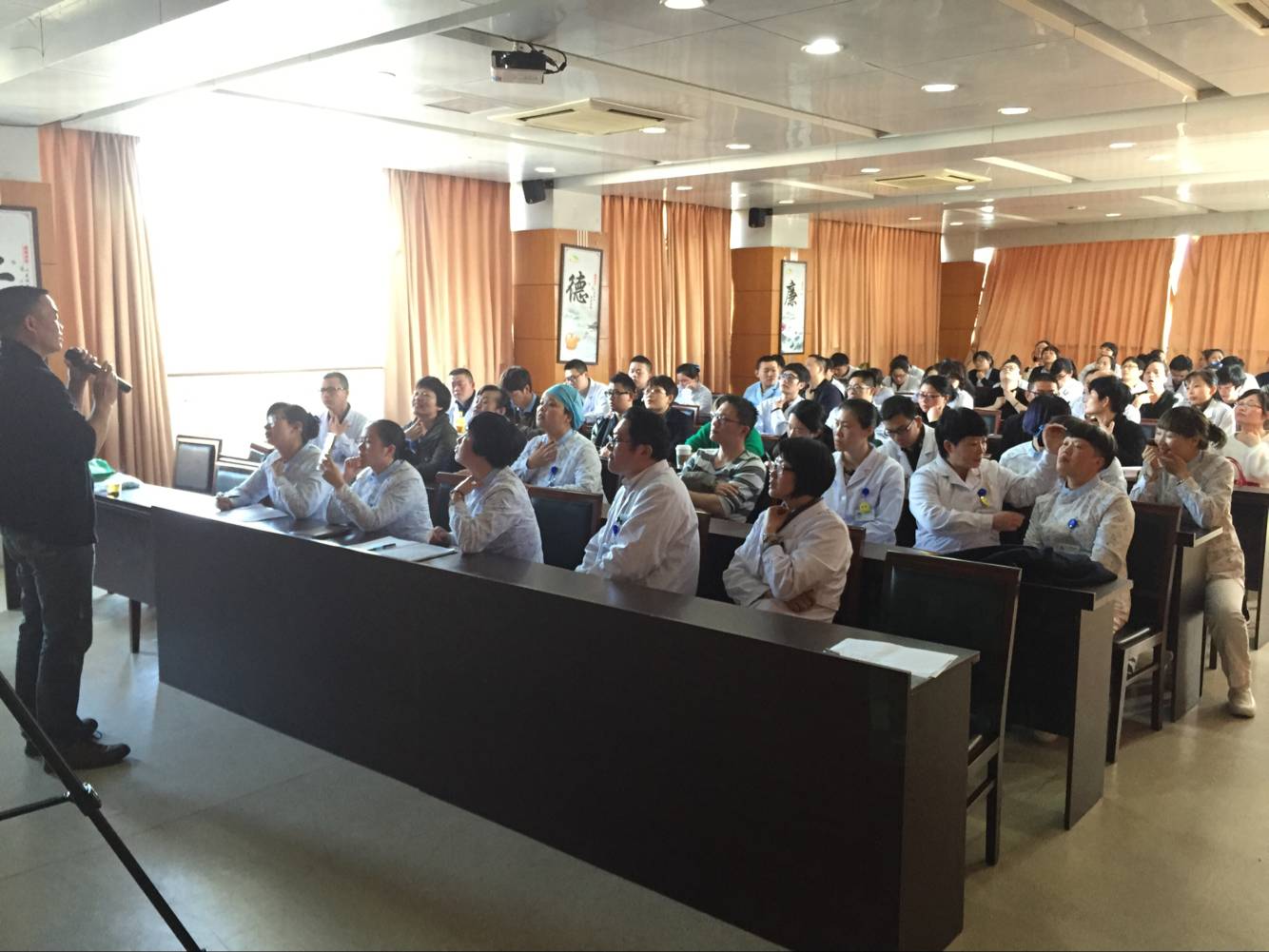 康复楼六楼会议室里座无虚席,临时还加了不少的座位,从侧面也反映了临床医务人员对实操技术的渴求。陈主任拿模型与器械边演示,边讲解,大家一边听一边记录重点,来不及记的就赶紧拍照、录像。为了教学更加生动,陈主任邀请一名志愿者上台,在真人身上进行环甲膜位置的确定,并用笔做好标志。台下不少医生及护士都纷纷上台请陈主任帮助确定环甲膜的位置。
