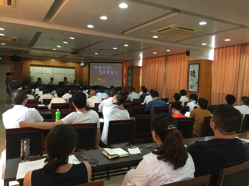 为进一步落实省、市卫计委关于开展治理医药购销领域商业贿赂,把干部廉政建设放在更加突出的位置,提高干部廉洁自律意识,更好地预防职务犯罪,7月20日下午,我院开展“珍惜岗位,远离职务犯罪”警示教育,会议由林小东院长主持,胡立荣书记进行讲解。院领导、中层干部、临床医师、医技、药剂、设备、总务等工作人员约70余人参加会议。胡立荣书记以“珍惜岗位,远离职务犯罪”为题对腐败及职务犯罪进行了概述,同时配合廉政短片的播放,向大家介绍了近年来反腐斗争的基本情况,重点讲解了医疗系统腐败案件的特点,分析了职务犯罪的原因,强调了预防职务犯罪工作的意义,并提出了预防对策。告诫与会人员要算好“4笔帐”,即经济帐、自由帐、亲情帐、政治帐。