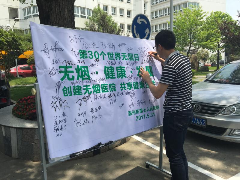 市七医作为一家省级健康促进医院,一直以来积极开展禁烟工作,创建无烟医院。为增强员工禁烟意识,在第30个世界无烟日到来之际,防治科在医院食堂门口进行了禁烟宣传签字活动,全院职工积极响应,反响热烈,共有100余人参与签名。