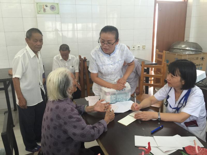 在当天的看诊过程中,有一位60多岁老年患者,他的血压达到204/120mmHg,却没有定期定时服务降压药。在得知自己血压很高时,老人说:“我早上刚喝了酒。这酒我也戒不掉!”“为了你的身体着想,最好还是不要喝酒啦!”义诊的医护人员耐心地解释并看诊,并陪伴他进行心电图和血糖测试。最后,由老年科于明荣主任医师为其详细诊断,向其再次宣教长期过量饮酒的危险性,以及叮嘱服用降压药的必要性。“楼上还有两个老人,麻烦给他们测一测血糖,我们好注意他俩的饮食。”在敬老院院长的带领下,医护人员对两名长期卧床,生活不能自理的老人进行了详细看诊。