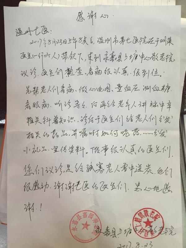 8月23日,我院“蒲公英之旅”第三站走进永嘉县上塘中心养老院。对于“七医人”来说,这只是一次普通又平常的义诊活动,却意外收到一份特殊的“礼物”。