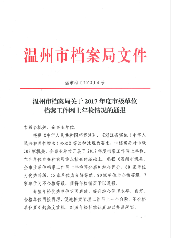 温州市档案局近日印发了关于2017年度市级单位档案工作网上年检情况的通报表彰文件,我院榜上有名,被评定为年度档案工作优秀单位。