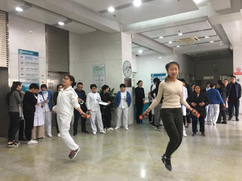 单人跳绳比赛在集体跳绳之后举行,比赛内容为每名选手在一分钟内跳的个数。七医的员工,果然卧虎藏龙!比赛声一响,一个个如小旋风般跳动起来,让围观的职工不时发出阵阵惊叹。跳绳的花样繁多,单脚轮换式,双脚齐跳式,随着绳在空气中抽动的脆响,场内气氛节节攀升。