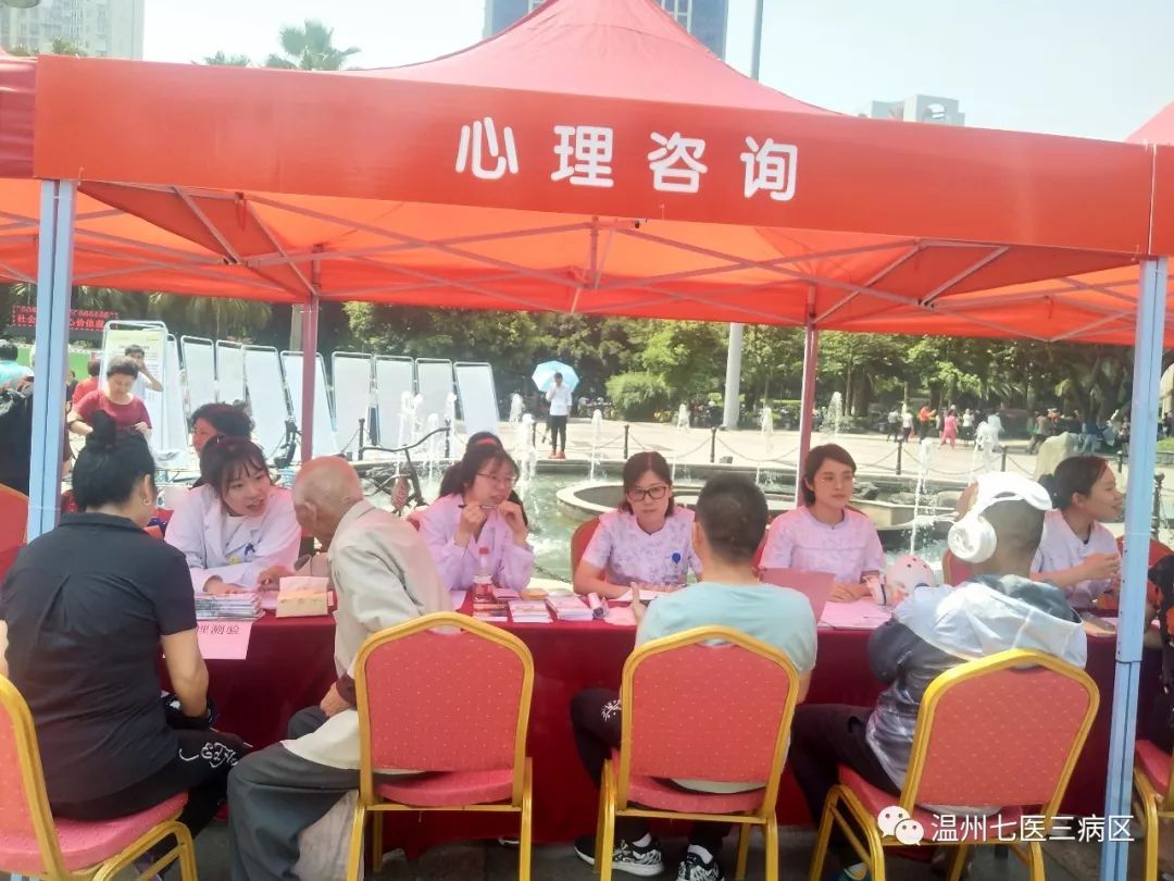 我院的四位志愿者黄佳佳、林晓曙、张夙兮、陈曼在护理部方春霞主任的领导下早早来到活动现场,布置会场,为排队等待的市民提供心理咨询。