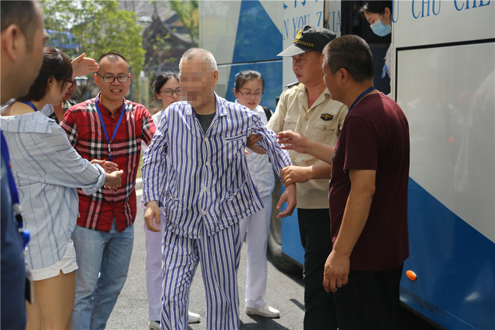 老年精神科患者行动不便、年纪大,需要医护人员搀扶、推轮椅,或者是担架运送才能完成安全转移。但由于医护人员资源有限,行政人员忙里见缝插针,也加入到护送患者的行列中来。
