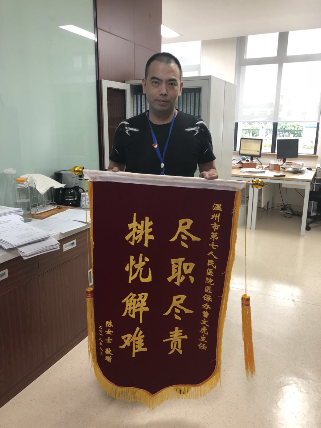 “谢谢医院领导,谢谢医保办,谢谢你们这些好政策。”伴着这简短的感激之言,8月24日上午,患者家属陈女士将写着“尽职尽责 排忧解难”的一面锦旗递到了我院医保办曹主任的手中。