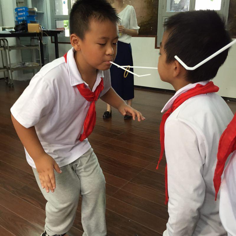 “啄木鸟行动”是每个人把吸管衔在嘴巴里,双手放在背后,扮成“啄木鸟”,口衔吸管传递“虫子”,按顺序依次传递,只能在吸管间传递,不能用手,先传到最后一位同学的组获胜,分组进行两次PK。在游戏中,我们能明显的发现,第一次PK中小朋友为快速完成任务,会手忙脚乱甚至会相互指责,难以达到他们预期的目标。经过一轮比拼后,咨询师指导他们要在游戏中保持平常心,不可以指责自己的伙伴,一定要耐心的相互帮助相互鼓励,经过指导后,小朋友们在第二次游戏中显得耐心、安静很多,最后完成任务的时间比第一次也大大的缩短。一个简单的小游戏就能让他们去思考团队合作的意义。