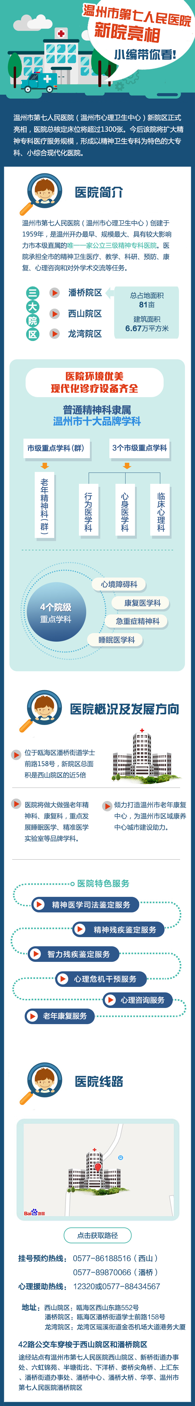 记者了解到,自5月份试运行以来,温州七医潘桥院区已经预开设了普通精神科、内科(消化内科、神经内科)等科室。正式开诊后,医院将陆续设置心理科、心理咨询科、儿童心理科、老年精神(心理)科、睡眠障碍、焦虑障碍、物质(酒精)依赖等专病门诊。同时,新院区还将陆续开设精神医学司法鉴定、精神残疾鉴定、智力残疾鉴定、心理危机干预等服务。