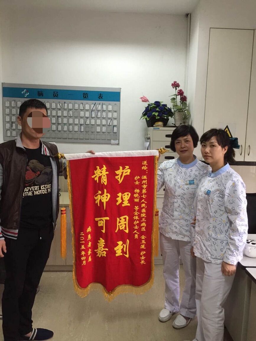 周姓患者因为“强迫障碍”曾多次入住我院治疗。在去年至今的三次住院期间,医护人员对患者都关爱有加,悉心照顾。特别是护士长金玉莲与护士杨晓丽,不但在患者住院期间给予全方位的护理、宣教及帮助,还在患者出院后予以延伸服务,经常打电话关心患者的疾病发展情况,帮助与监督患者遵医嘱正确服药。这不仅提高了患者的服药依从性,更调动了患者的社会支持系统,帮助患者树立自信心,从事力所能及的工作,最终回归社会。