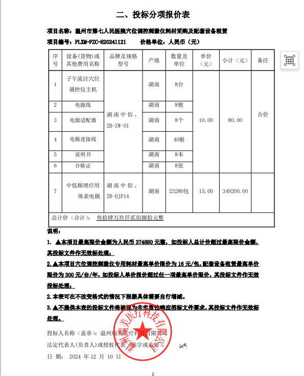 | 1 | 投标总价(以上各报价之和):349280(元) | 温州瑞美医疗科技有限公司 | 温州市瓯海区潘桥街道宁波路电子商务大厦A幢703室 |